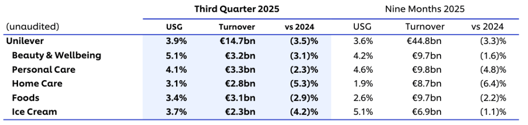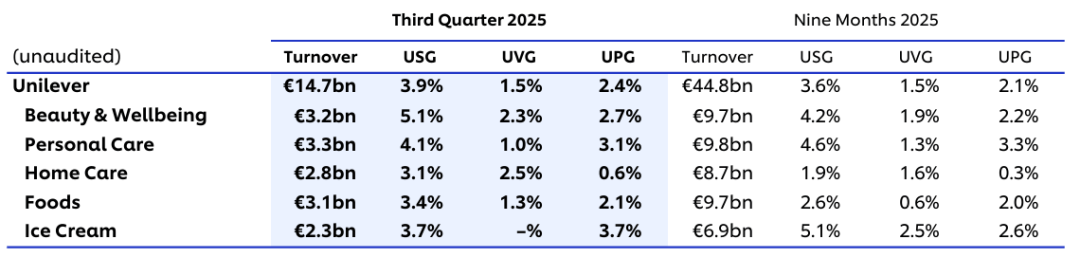 排除汇率、业务剥离等因素影响后,联合利华前三季基础销售额(USG)增长3.6%。