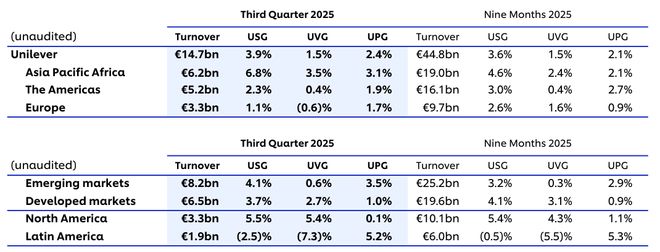 表示:“我们正在打造一个面向未来的品牌组合,涵盖更多美妆、健康和个人护理领域,优先发展高端市场和电子商务,并以美国和印度作为增长的核心市场。”结合此次财报中联合利华各地区表现来看,亚太及非洲地区2025年前三季度营收为190.01亿欧元(约合人民币1570.33亿元),同比下跌4.4%,系联合利华营收贡献第一大市场。第三季度基础销售额增长6.8%,占总营收42%;美洲市场、欧洲市场前三季度则分别同比下滑5.9%、增长1.9%,占Q3总营收35%、23%。