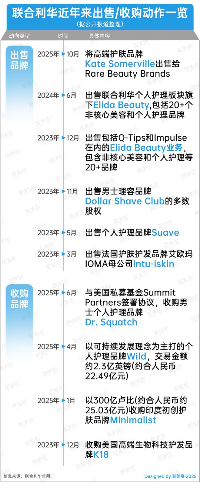 近年来,其已出售Kate Somerville、Dollar Shave Club、Suave及Elida Beauty旗下包含Q-Tips、Impulse在内的逾20个非核心美容与个护品牌。