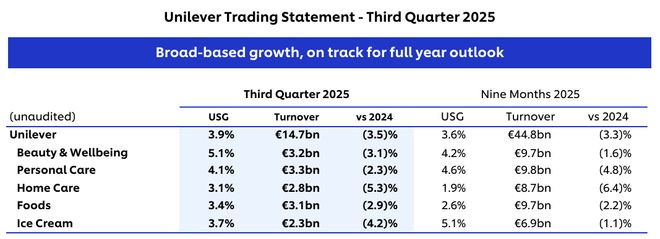 今日(10月23日),联合利华发布了2025年第三季度业绩报告。财报显示,联合利华2025年前9个月营业额为448亿欧元(约合人民币3703亿元),同比下滑3.5%;其中,Q3营收147亿欧元(约合人民币1215亿元),基本销售额增长3.9%。