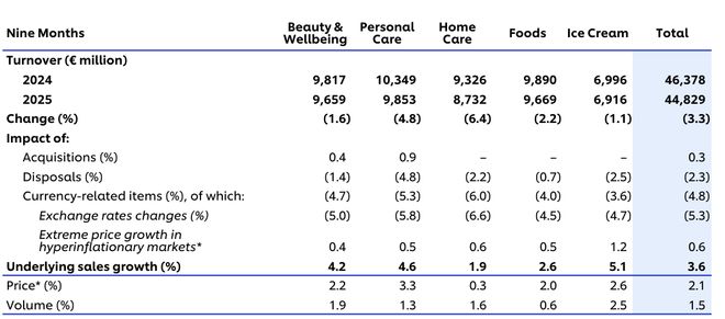 今日(10月23日),联合利华发布了2025年第三季度业绩报告。财报显示,联合利华2025年前9个月营业额为448亿欧元(约合人民币3703亿元),同比下滑3.5%;其中,Q3营收147亿欧元(约合人民币1215亿元),基本销售额增长3.9%。